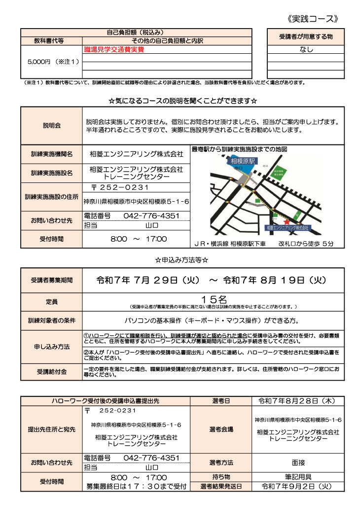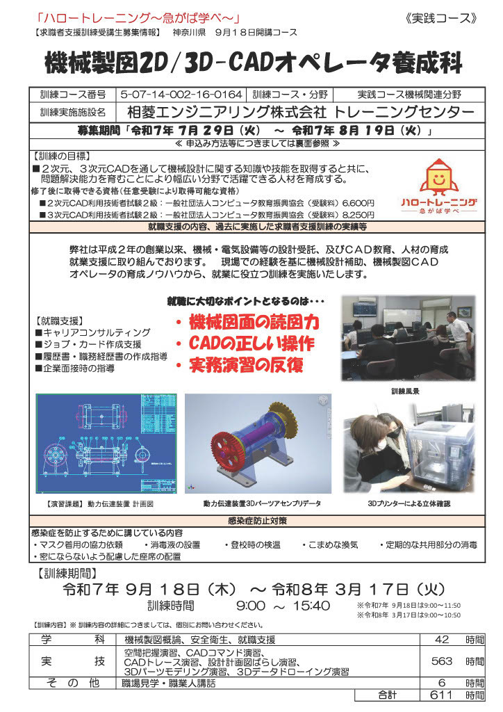 「求職者支援訓練で、9月開講の機械製図2D/3D-CADオペレータ養成科の訓練受講したいのですが・・・。」とハローワーク受付担当者様にお尋ねください。