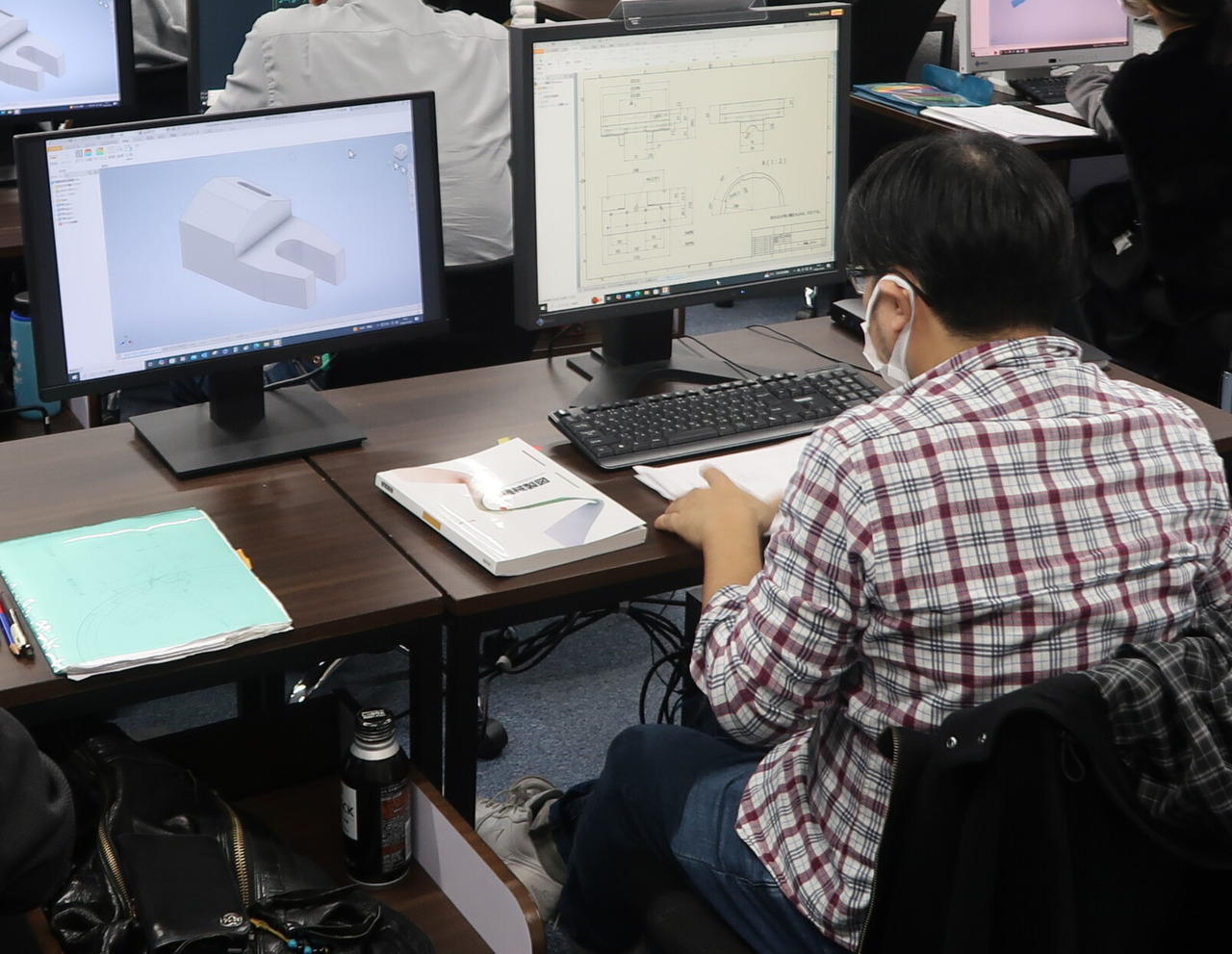 訓練では、機械製図の基礎から3D-CADまで、実務経験豊富な講師が伴走します。